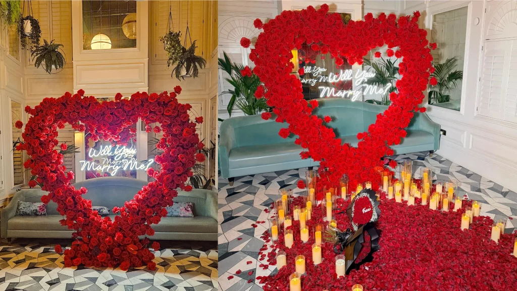 Ideally, begin planning 2-3 months before your intended proposal date. This timeline allows adequate time to secure quality vendors like event stylists and photographers who may book up weeks in advance, especially during popular proposal seasons. It also provides time for thoughtful design development, permits if needed, and backup planning. However, if you’re ready to propose sooner, don’t panic, at Florals of Splendour, we’ve successfully created stunning proposal setups on shorter timelines. The key is communicating your needs clearly and being flexible with scheduling. Some elements, like luxury florals and basic styling, can be arranged relatively quickly if vendors have availability.